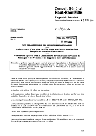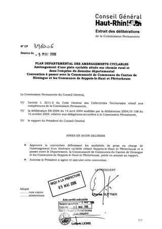 Plan départemental des aménagements cyclables - aménagement d'une piste cyclable située sur chemin rural et dans l'emprise du domaine départemental - convention à passer avec la Commune du canton de HIRSINGUE et les communes de SEPPOIS-LE-HAUT et PFETTERH