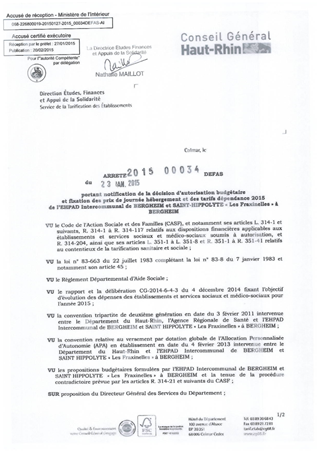 portant notification de la décision d'autorisation budgétaire et fixation des prix de journée hébergement et des tarifs dépendance 2015 de l'EHPAD Intercommunal de BERGHEIM et SAINT-HIPPOLYTE "Les Fraxinelles" à BERGHEIM Resumé Pièces jointes ARRETE Assemblée : Non défini Date : 23/01/2015 Rapporteur : Non défini Collectivité : Conseil départemental du Haut-Rhin Direction : Non défini Service : Direction Etudes, Finances et Appuis de la Solidarité Domaine : Prix de Journée Commission :