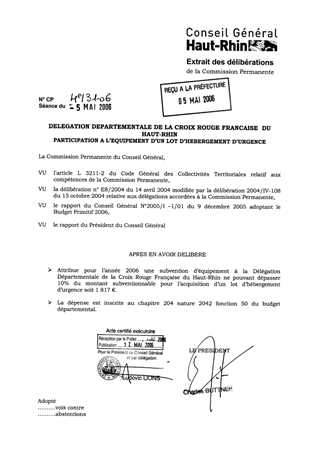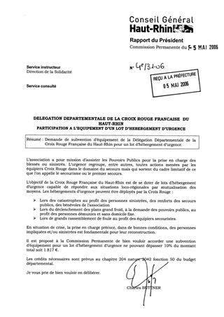 Délégation départementale de la Croix Rouge Française du Haut-Rhin. Participation à l'équipement d'un lot d'hébergement d'urgence Resumé Pièces jointes DELIBERATION RAPPORT Assemblée : Commission Permanente Date : 05/05/2006 Rapporteur : Non défini Collectivité : Conseil départemental du Haut-Rhin Direction : Non défini Service : Direction Adjointe Prévention / Insertion Domaine : Commission : Commission Permanente