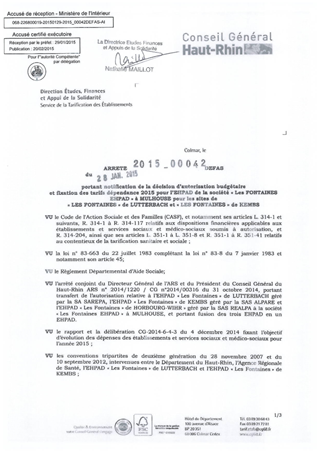 portant notification de la décision d'autorisation budgétaire et fixation des prix de journée hébergement et des tarifs dépendance 2015 pour l'EHPAD de la société "Les Fontaines EHPAD" à MULHOUSE pour les sites de "Les Fontaines" de LUTTERBACH et "Les Fon