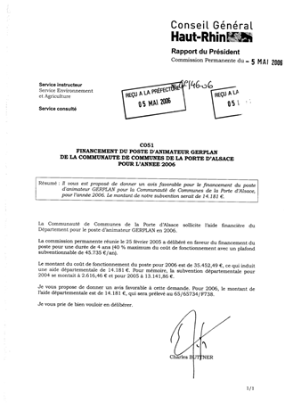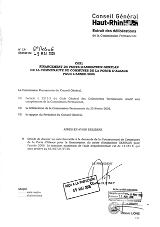 Financement du poste d'animateur Gerplan de la ComCom de la porte d'Alsace pour 2006 Resumé Pièces jointes DELIBERATION RAPPORT Assemblée : Commission Permanente Date : 05/05/2006 Rapporteur : Non défini Collectivité : Conseil départemental du Haut-Rhin Direction : Non défini Service : Service Environnement et Agriculture Domaine : Commission : Commission Permanente