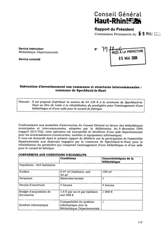 Subvention d'investissement aux communes et structures intercommunales : commune de SPECHBACH-le-Haut Resumé Pièces jointes DELIBERATION RAPPORT Assemblée : Commission Permanente Date : 05/05/2006 Rapporteur : Non défini Collectivité : Conseil départemental du Haut-Rhin Direction : Non défini Service : Service de la Médiathèque Départementale Domaine : Commission : Commission Permanente