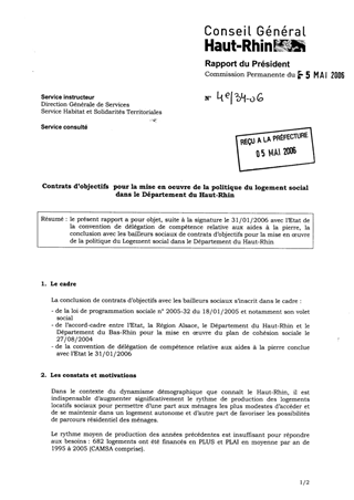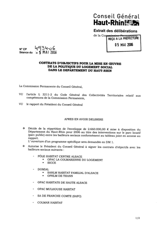Contrats d'objectifs pour la mise en œuvre de la politique du logement social dans le Département du Haut-Rhin Resumé Pièces jointes DELIBERATION RAPPORT Assemblée : Commission Permanente Date : 05/05/2006 Rapporteur : Non défini Collectivité : Conseil départemental du Haut-Rhin Direction : Non défini Service : Service Habitat et Solidarités Territoriales Domaine : Commission : Commission Permanente