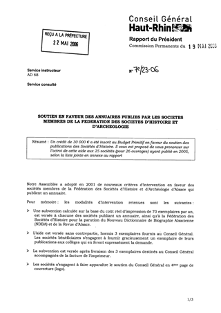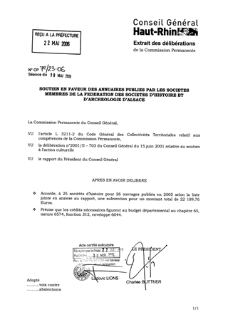 Soutien en faveur des annuaires publiés par les sociétés membres de la fédération des sociétés d'histoire et d'archéologie Resumé Pièces jointes DELIBERATION RAPPORT Assemblée : Commission Permanente Date : 19/05/2006 Rapporteur : Non défini Collectivité : Conseil départemental du Haut-Rhin Direction : Non défini Service : Service des Archives Départementales Domaine : Commission : Commission Permanente