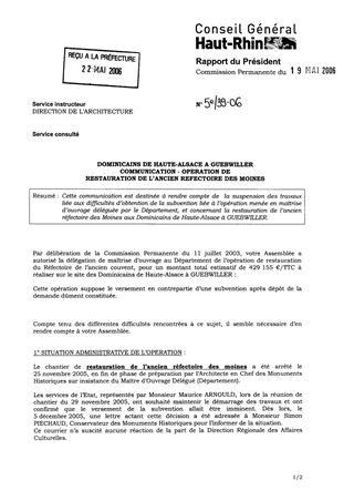 Dominicains de Haute-Alsace à Guebwiller - Communication - Opération de restauration ancien réfectoire des moines Resumé Pièces jointes DELIBERATION RAPPORT Assemblée : Commission Permanente Date : 19/05/2006 Rapporteur : Non défini Collectivité : Conseil départemental du Haut-Rhin Direction : Non défini Service : Direction de l'Architecture Domaine : Commission : Commission Permanente