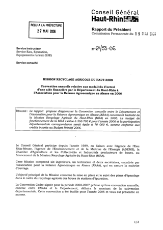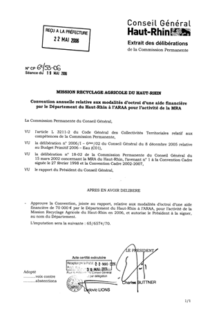 Mission recyclage agricole du Haut-Rhin - Convention avec l'association pour la relance agronomique en Alsace Resumé Pièces jointes DELIBERATION RAPPORT Assemblée : Commission Permanente Date : 19/05/2006 Rapporteur : Non défini Collectivité : Conseil départemental du Haut-Rhin Direction : Non défini Service : Direction de l'Environnement et du Cadre de Vie Domaine : Commission : Commission Permanente