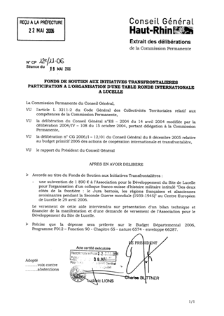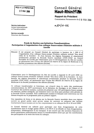 Fonds de soutien aux initiatives transfrontalières - Participation à l'organisation d'un colloque franco-suisse d'histoire militaire à Lucelle Resumé Pièces jointes DELIBERATION RAPPORT Assemblée : Commission Permanente Date : 19/05/2006 Rapporteur : Non défini Collectivité : Conseil départemental du Haut-Rhin Direction : Non défini Service : Service de l'Action Internationale, Transfrontalière et Européenne Domaine : Commission : Commission Permanente