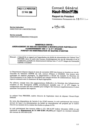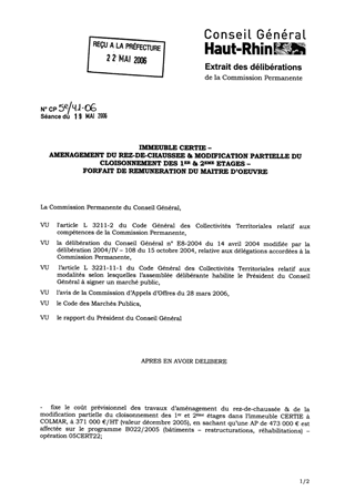 Immeuble Certie - Aménagement du rez-de-chaussée et modification partielle du cloisonnement des 1er et 2e étages Resumé Pièces jointes DELIBERATION RAPPORT Assemblée : Commission Permanente Date : 19/05/2006 Rapporteur : Non défini Collectivité : Conseil départemental du Haut-Rhin Direction : Non défini Service : Direction de l'Architecture Domaine : Commission : Commission Permanente