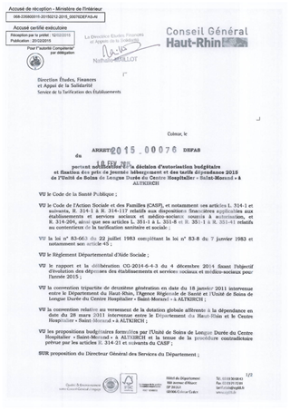 portant notification de la décision d'autorisation budgétaire et fixation des prix de journée hébergement et des tarifs dépendance 2015 de l'EHPAD de l'unité de soins de longue durée du centre hospitalier "Saint-Morand" à ALTKIRCH Resumé Pièces jointes ARRETE Assemblée : Non défini Date : 10/02/2015 Rapporteur : Non défini Collectivité : Conseil départemental du Haut-Rhin Direction : Non défini Service : Direction Etudes, Finances et Appuis de la Solidarité Domaine : Prix de Journée Commission :