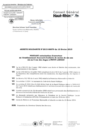portant autorisation d'ouverture de l'établissement d'accueil d'enfants de moins de six ans sis au 5 rue des Anges à PETIT-LANDAU Resumé Pièces jointes ARRETE Assemblée : Non défini Date : 10/02/2015 Rapporteur : Non défini Collectivité : Conseil départemental du Haut-Rhin Direction : Non défini Service : Direction Enfance Santé Insertion Domaine : Accueil d'enfants Commission :