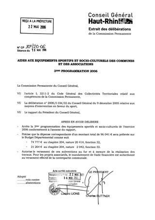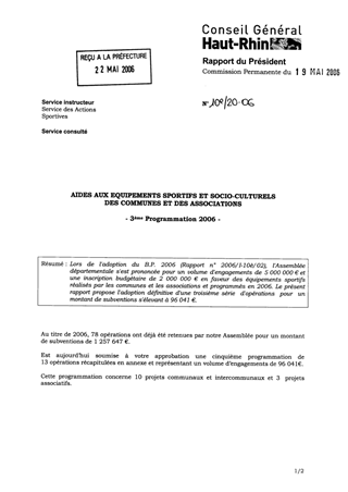 Aides aux équipements sportifs et socio-culturels des communes et des associations Resumé Pièces jointes DELIBERATION RAPPORT Assemblée : Commission Permanente Date : 19/05/2006 Rapporteur : Non défini Collectivité : Conseil départemental du Haut-Rhin Direction : Non défini Service : Service des Actions Sportives Domaine : Commission : Commission Permanente