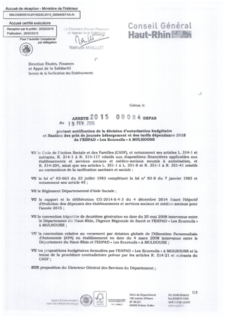 portant notification de la décision d'autorisation budgétaire et fixation des prix de journée hébergement et des tarifs dépendance 2015 de l'EHPAD "Les Ecureuils" à MULHOUSE Resumé Pièces jointes ARRETE Assemblée : Non défini Date : 19/02/2015 Rapporteur : Non défini Collectivité : Conseil départemental du Haut-Rhin Direction : Non défini Service : Direction Etudes, Finances et Appuis de la Solidarité Domaine : Prix de Journée Commission :
