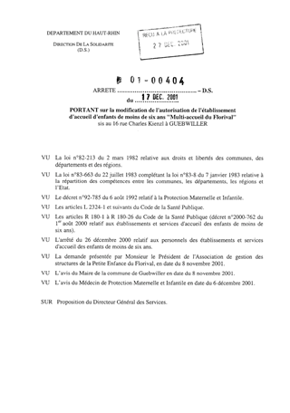 Portant sur la modification de l'autorisation de l'établissement d'accueil d'enfants de moins de six ans "Multi-accueil du Florival" sis au 16 rue Charles Kienzl à Guebwiller Resumé Pièces jointes ARRETE Assemblée : Non défini Date : 17/12/2001 Rapporteur : Non défini Collectivité : Conseil départemental du Haut-Rhin Direction : Non défini Service : Direction de la Solidarité Domaine : Accueil d'enfants Commission :