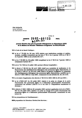 portant fixation des prix de journée hébergement et dépendance 2003 de la maison de retraite "Résidence d'Argenson" de BOLLWILLER. Resumé Pièces jointes ARRETE Assemblée : Non défini Date : 01/04/2003 Rapporteur : Non défini Collectivité : Conseil départemental du Haut-Rhin Direction : Non défini Service : Direction de la Solidarité Domaine : Prix de Journée Commission :