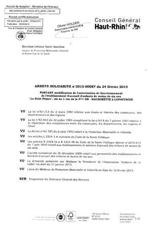 portant modification de l'autorisation de fonctionnement de l'établissement d'accueil d'enfants de moins de six ans "Le Petit Prince", sis au 1 rue de la 5ème DB - Hachimette à LAPOUTROIE Resumé Pièces jointes ARRETE Assemblée : Non défini Date : 24/02/2015 Rapporteur : Non défini Collectivité : Conseil départemental du Haut-Rhin Direction : Non défini Service : Direction Enfance Santé Insertion Domaine : Accueil d'enfants Commission :