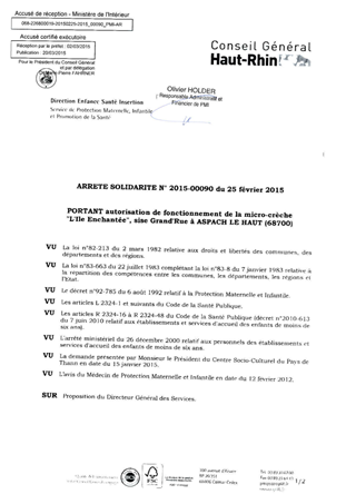 portant autorisation de fonctionnement de la micro-crèche "L'Ile Enchantée", sis Grand'Rue à ASPACH (68700) Resumé Pièces jointes ARRETE Assemblée : Non défini Date : 25/02/2015 Rapporteur : Non défini Collectivité : Conseil départemental du Haut-Rhin Direction : Non défini Service : Direction Enfance Santé Insertion Domaine : Accueil d'enfants Commission :
