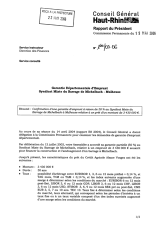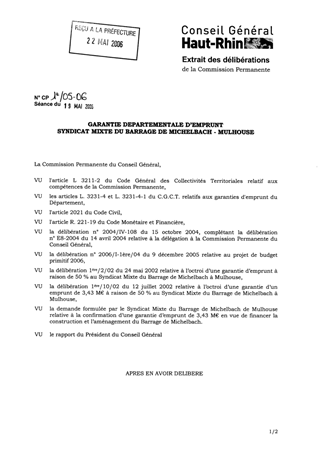 Garantie départementale d'Emprunt - Syndicat Mixte du Barrage de Michelbach - Mulhouse Resumé Pièces jointes DELIBERATION RAPPORT Assemblée : Commission Permanente Date : 19/05/2006 Rapporteur : Non défini Collectivité : Conseil départemental du Haut-Rhin Direction : Non défini Service : Direction des Finances Domaine : Social / Solidarité Commission : Commission Permanente