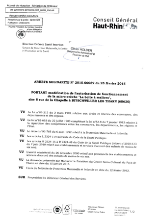 portant modification de l'autorisation de fonctionnement de la micro-crèche "La boîte à malices", sise 8 rue de la Chapelle à BITSCHWILLER LES THANN (68620) Resumé Pièces jointes ARRETE Assemblée : Non défini Date : 25/02/2015 Rapporteur : Non défini Collectivité : Conseil départemental du Haut-Rhin Direction : Non défini Service : Direction Enfance Santé Insertion Domaine : Accueil d'enfants Commission :
