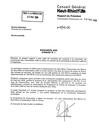 Solidarité Asie - Avenant n° 1 Resumé Pièces jointes DELIBERATION RAPPORT Assemblée : Commission Permanente Date : 19/05/2006 Rapporteur : Non défini Collectivité : Conseil départemental du Haut-Rhin Direction : Non défini Service : Direction de la Solidarité Domaine : Commission : Commission Permanente