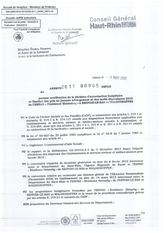 portant notification de la décision d'autorisation budgétaire et fixation des prix de journée hébergement et des tarifs dépendance 2015 de l'EHPAD "Résidence Heimeling" à SEPPOIS LE BAS et WALDIGHOFFEN Resumé Pièces jointes ARRETE Assemblée : Non défini Date : 03/03/2015 Rapporteur : Non défini Collectivité : Conseil départemental du Haut-Rhin Direction : Non défini Service : Direction Etudes, Finances et Appuis de la Solidarité Domaine : Prix de Journée Commission :