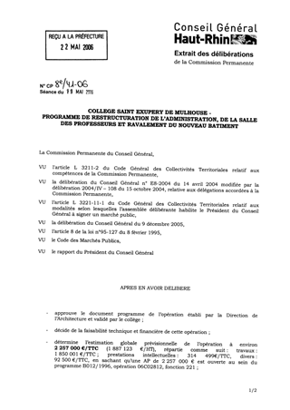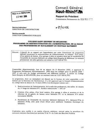 Collège Saint-Exupéry de Mulhouse - Programme de restructuration de l'administration, de la salle des professeurs et ravalement du nouveau bâtiment Resumé Pièces jointes DELIBERATION RAPPORT Assemblée : Commission Permanente Date : 19/05/2006 Rapporteur : Non défini Collectivité : Conseil départemental du Haut-Rhin Direction : Non défini Service : Direction de l'Architecture Domaine : Commission : Commission Permanente