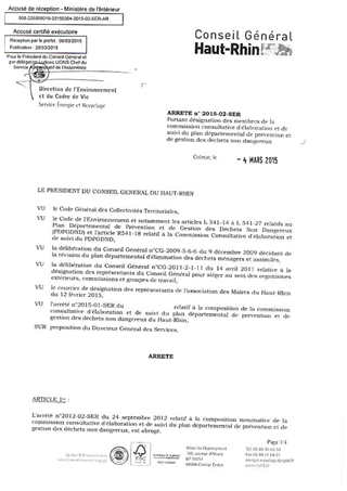 portant désignation des membres de la commission consultative d'élaboration et de suivi du plan départemental de prévention et de gestion des déchets non dangereux Resumé Pièces jointes ARRETE Assemblée : Non défini Date : 04/03/2015 Rapporteur : Non défini Collectivité : Conseil départemental du Haut-Rhin Direction : Non défini Service : Direction de l'Environnement et du Cadre de Vie Domaine : Autres (non classés) Commission :