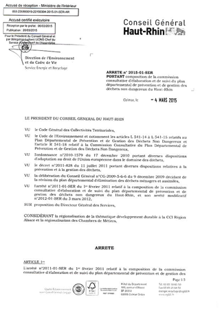 portant compositiion de la commission consultative d'élaboration et de suivi du plan départemental de prévention et de gestion des déchets non dangereux du Haut-Rhin Resumé Pièces jointes ARRETE Assemblée : Non défini Date : 04/03/2015 Rapporteur : Non défini Collectivité : Conseil départemental du Haut-Rhin Direction : Non défini Service : Direction de l'Environnement et du Cadre de Vie Domaine : Autres (non classés) Commission :
