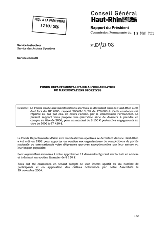 Fonds départemental d'aide à l'organisation de manifestations sportives Resumé Pièces jointes DELIBERATION RAPPORT Assemblée : Commission Permanente Date : 19/05/2006 Rapporteur : Non défini Collectivité : Conseil départemental du Haut-Rhin Direction : Non défini Service : Service des Actions Sportives Domaine : Social / Solidarité Commission : Commission Permanente
