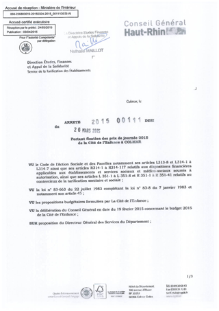portant fixation des prix de journée 2015 de la Cité de l'Enfance Resumé Pièces jointes ARRETE Assemblée : Non défini Date : 20/03/2015 Rapporteur : Non défini Collectivité : Conseil départemental du Haut-Rhin Direction : Non défini Service : Direction Etudes, Finances et Appuis de la Solidarité Domaine : Prix de Journée Commission :