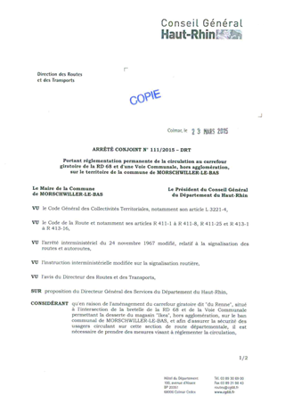 portant réglementation permanente de la circulation au carrefour giratoire de la RD 68 et d'une voie communale, hors agglomération, sur le territoire de la commune de MORSCHWILLER LE BAS Resumé Pièces jointes ARRETE Assemblée : Non défini Date : 23/03/2015 Rapporteur : Non défini Collectivité : Conseil départemental du Haut-Rhin Direction : Non défini Service : Direction des Routes Domaine : Circulation Commission :