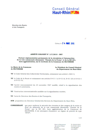 portant réglementation permanente de la circulation à l'intersection de la voie communale dénommée "Chemin de la Ferme" et de la RD 201, hors agglomération, sur le territoire de la commune de BILTZHEIM Resumé Pièces jointes ARRETE Assemblée : Non défini Date : 24/03/2015 Rapporteur : Non défini Collectivité : Conseil départemental du Haut-Rhin Direction : Non défini Service : Direction des Routes Domaine : Circulation Commission :