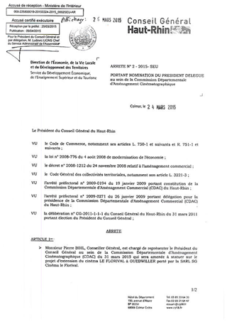 portant nomination du Président délégué au sein de la Commission Départementale d'Aménagement Cinématographique Resumé Pièces jointes ARRETE Assemblée : Non défini Date : 24/03/2015 Rapporteur : Non défini Collectivité : Conseil départemental du Haut-Rhin Direction : Non défini Service : Direction de l'Aménagement du Territoire et de l'Economie Domaine : Autres (non classés) Commission :