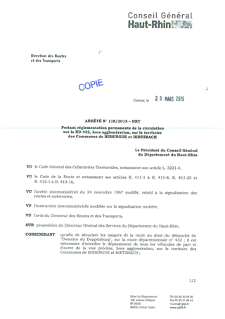 portant réglementation permanente de la circulation sur la RD 432, hors agglomération, sur le territoire des communes de HIRSINGUE et HIRTZBACH Resumé Pièces jointes ARRETE Assemblée : Non défini Date : 25/03/2015 Rapporteur : Non défini Collectivité : Conseil départemental du Haut-Rhin Direction : Non défini Service : Direction des Routes Domaine : Circulation Commission :