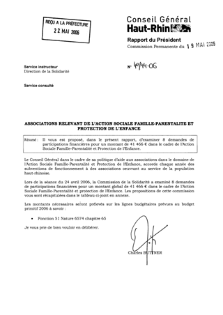 Associations relevant de l'action sociale famille-parentalité et protection de l'enfance Resumé Pièces jointes DELIBERATION RAPPORT Assemblée : Commission Permanente Date : 19/05/2006 Rapporteur : Non défini Collectivité : Conseil départemental du Haut-Rhin Direction : Non défini Service : Direction de la Solidarité Domaine : Aides / Subventions Commission : Commission Permanente