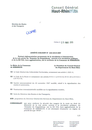 portant réglementation permanente de la circulation à l'intersection de la voie privée du "Domaine du Doppelsburg", ouverte à la circulation publique, et de la RD 432, hors agglomération, sur le territoire de la commune de HIRSINGUE Resumé Pièces jointes ARRETE Assemblée : Non défini Date : 25/03/2015 Rapporteur : Non défini Collectivité : Conseil départemental du Haut-Rhin Direction : Non défini Service : Direction des Routes Domaine : Circulation Commission :