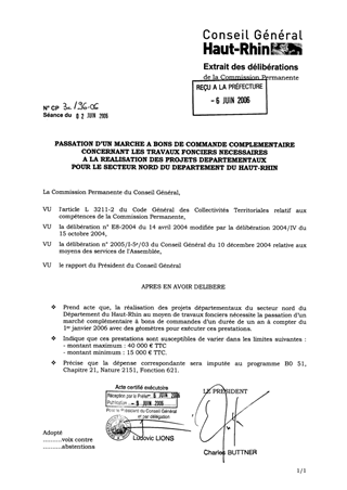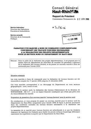 Dans le cadre de la réalisation des projets départementaux, il est proposé pour le secteur Nord du Département du Haut-Rhin de consulter les géomètres s’agissant de la réalisation des travaux fonciers, et de passer un nouveau marché à bons de commande pour l’année 2006.
