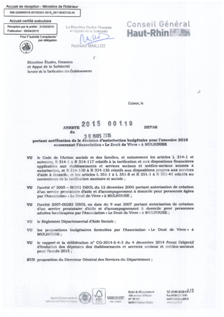 portant notification de la décision d'autorisation budgétaire pour l'exercice 2015 concernant l'Association "Le Droit de Vivre" à MULHOUSE Resumé Pièces jointes ARRETE Assemblée : Non défini Date : 30/03/2015 Rapporteur : Non défini Collectivité : Conseil départemental du Haut-Rhin Direction : Non défini Service : Direction Etudes, Finances et Appuis de la Solidarité Domaine : Dotations financières Commission :