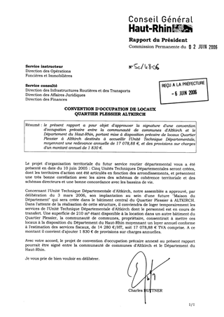le présent rapport a pour objet d'approuver la signature d'une convention d'occupation précaire entre la communauté de communes d'Altkirch et le Département du Haut-Rhin, portant mise à disposition précaire de locaux Quartier Plessier à Altkirch destinés à accueillir l'Unité Technique Départementale, moyennant une redevance annuelle de 17 078,88 €, et des provisions sur charges d'un montant annuel de 1 830 €.