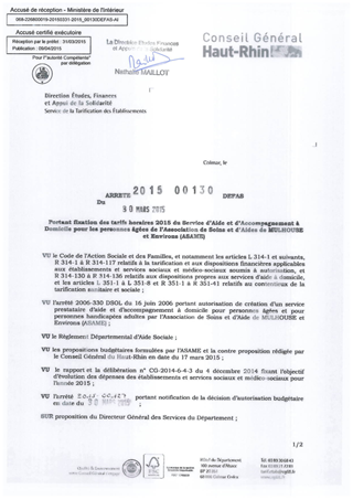 portant fixation des tarifs horaires 2015 du service d'aide et d'accompagnement à domicile pour les personnes âgées de l'association de soins et d'aides de MULHOUSE et environs (ASAME) Resumé Pièces jointes ARRETE Assemblée : Non défini Date : 30/03/2015 Rapporteur : Non défini Collectivité : Conseil départemental du Haut-Rhin Direction : Non défini Service : Direction Etudes, Finances et Appuis de la Solidarité Domaine : Autres (non classés) Commission :