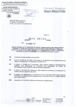 portant révision au 1er avril 2015 du tarif de remboursement des repas portés à domicile ou servis dans les foyers de l'association haut-rhinoise d'aide aux personnes âgées du Haut-Rhin (APAMAD), et l'association de soins et d'aides de MULHOUSE et environ