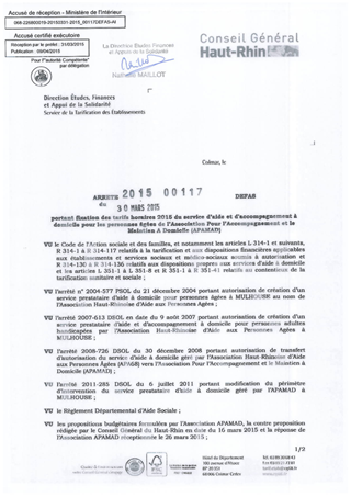 portant fixation des tarifs horaires 2015 du service d'aide et d'accompagnement à domicile pour les personnes âgées de l'Association pour l'Accompagnement et le Maintien à Domicile (APAMAD) Resumé Pièces jointes ARRETE Assemblée : Non défini Date : 30/03/2015 Rapporteur : Non défini Collectivité : Conseil départemental du Haut-Rhin Direction : Non défini Service : Direction Etudes, Finances et Appuis de la Solidarité Domaine : Personnes Agées Commission :