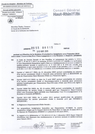 portant notification de la décision d'autorisation budgétaire pour l'exercice 2015 concernant l'association pour l'accompagnement et le maintien à domicile (APAMAD) Resumé Pièces jointes ARRETE Assemblée : Non défini Date : 30/03/2015 Rapporteur : Non défini Collectivité : Conseil départemental du Haut-Rhin Direction : Non défini Service : Direction Etudes, Finances et Appuis de la Solidarité Domaine : Dotations financières Commission :