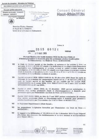 portant fixation des tarifs horaires 2015 du Service d'Aide et d'Accompagnement à Domicile pour les personnes adultes handicapées de l'association "Le Droit de Vivre" à MULHOUSE Resumé Pièces jointes ARRETE Assemblée : Non défini Date : 30/03/2015 Rapporteur : Non défini Collectivité : Conseil départemental du Haut-Rhin Direction : Non défini Service : Direction Etudes, Finances et Appuis de la Solidarité Domaine : Prix de Journée Commission :