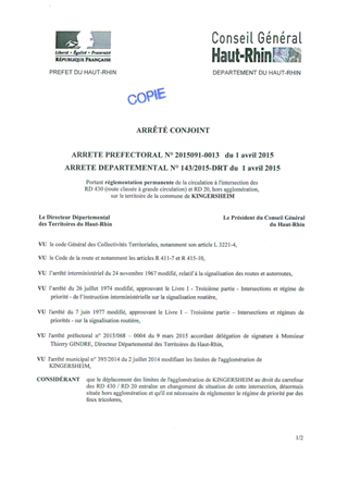 arrêté conjoint portant réglementation permanente de la circulation à l'intersection des RD 430 (route classée à grande circulation) et RD 20, hors agglomération, sur le territoire de la commune de KINGERSHEIM Resumé Pièces jointes ARRETE Assemblée : Non défini Date : 01/04/2015 Rapporteur : Non défini Collectivité : Conseil départemental du Haut-Rhin Direction : Non défini Service : Direction des Routes Domaine : Circulation Commission :