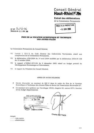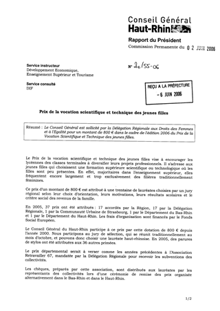 Le Conseil Général est sollicité par la Délégation Régionale aux Droits des Femmes et à l'Egalité pour un montant de 800 € dans le cadre de l'édition 2006 du Prix de la Vocation Scientifique et Technique des jeunes filles.