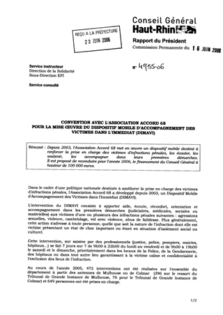 Depuis 2003, l'Association Accord 68 met en œuvre un dispositif mobile destiné à renforcer la prise en charge des victimes d'infractions pénales, les écouter, les soutenir, les accompagner dans leurs premières démarches. Il est proposé de reconduire pour l'année 2006, le financement du Conseil Général à hauteur de 100 000 euros.