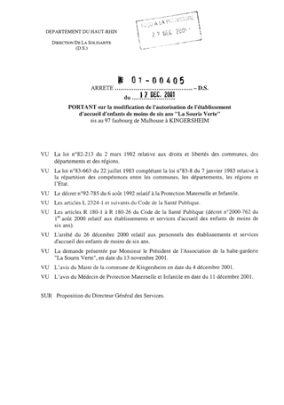 Portant sur la modification de l'autorisation de l'établissement d'accueil d'enfants de moins de six ans "La Souris Verte" sis au 97 faubourg de Mulhouse à Kingersheim Resumé Pièces jointes ARRETE Assemblée : Non défini Date : 17/12/2001 Rapporteur : Non défini Collectivité : Conseil départemental du Haut-Rhin Direction : Non défini Service : Solidarité Domaine : Accueil d'enfants Commission :