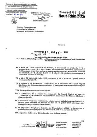 portant fixation du prix de journée 2015 de la maison d'enfants pour mineurs étrangers isolés demandeurs d'asile "Chemida" de MULHOUSE Resumé Pièces jointes ARRETE Assemblée : Non défini Date : 22/04/2015 Rapporteur : Non défini Collectivité : Conseil départemental du Haut-Rhin Direction : Non défini Service : Direction Etudes, Finances et Appuis de la Solidarité Domaine : Prix de Journée Commission :