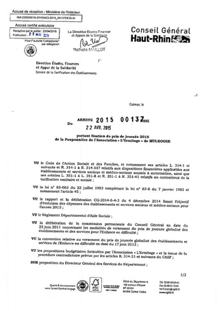 portant fixation du prix de journée 2015 de la pouponnière de l'Association "L'Ermitage" de MULHOUSE Resumé Pièces jointes ARRETE Assemblée : Non défini Date : 22/04/2015 Rapporteur : Non défini Collectivité : Conseil départemental du Haut-Rhin Direction : Non défini Service : Direction Etudes, Finances et Appuis de la Solidarité Domaine : Prix de Journée Commission :