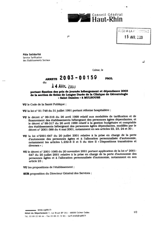 portant fixation des prix de journée hébergement et dépendance 2003 de la section de soins de longue durée de la clinique de gérontologie "Saint Damien" à MULHOUSE. Resumé Pièces jointes ARRETE Assemblée : Non défini Date : 14/04/2003 Rapporteur : Non défini Collectivité : Conseil départemental du Haut-Rhin Direction : Non défini Service : Direction de la Solidarité Domaine : Prix de Journée Commission :